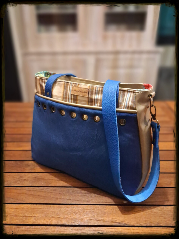 Découvrez l'alliance parfaite entre chic urbain et esprit artisanal avec ce grand cabas de la collection L'Écrin de Marcelline. Sa robe en velours bleu roi, d'une douceur incomparable, contraste élégamment avec un simili-cuir doré et un empiècement en tissu à carreaux aux tons naturels.