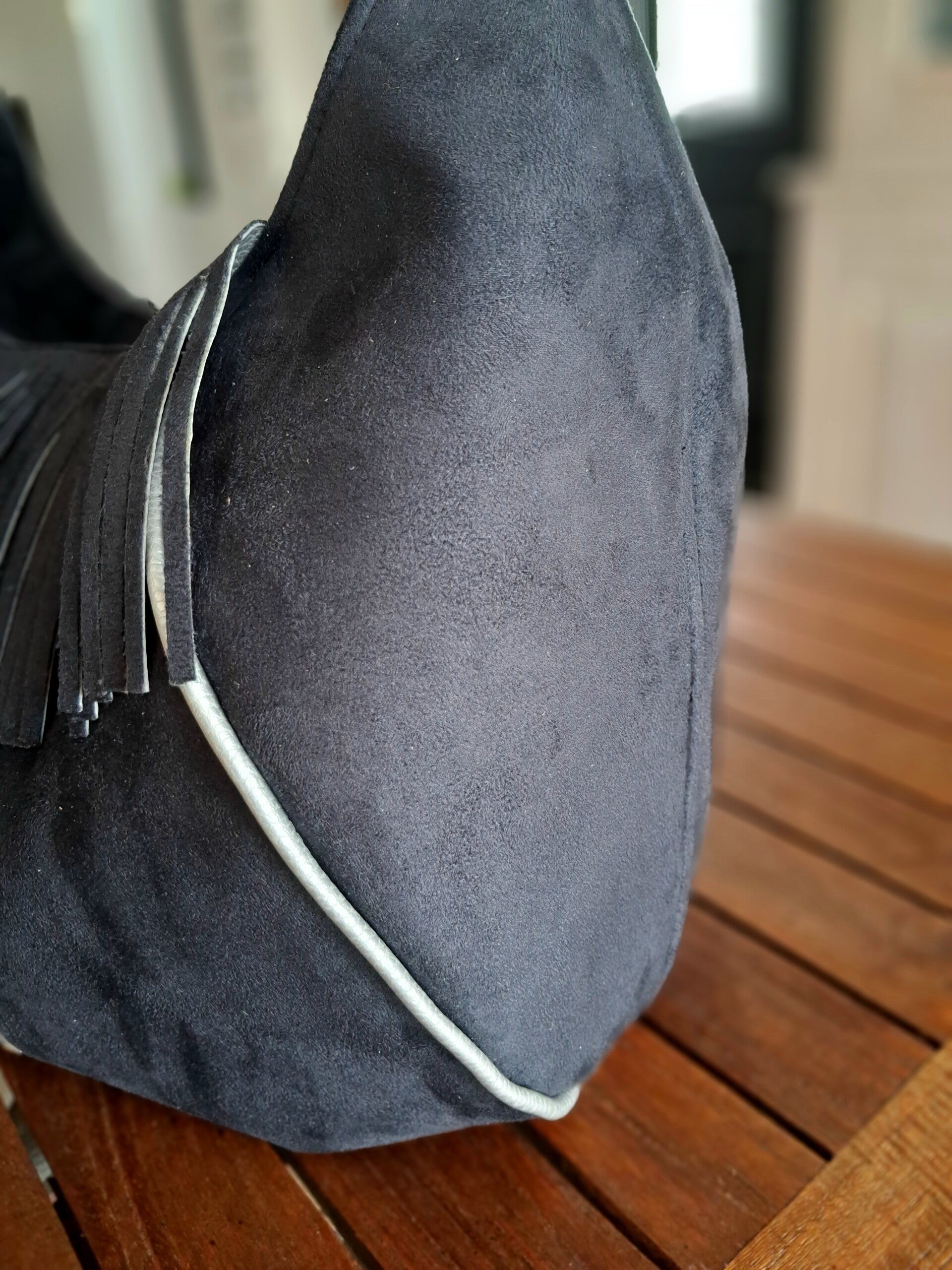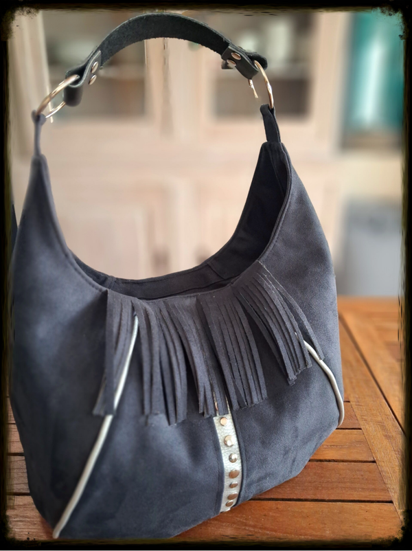 Confectionné dans une suédine noire d'une grande douceur, ce sac besace se distingue par ses longues franges et ses détails argentés qui apportent du mouvement et de l'éclat.