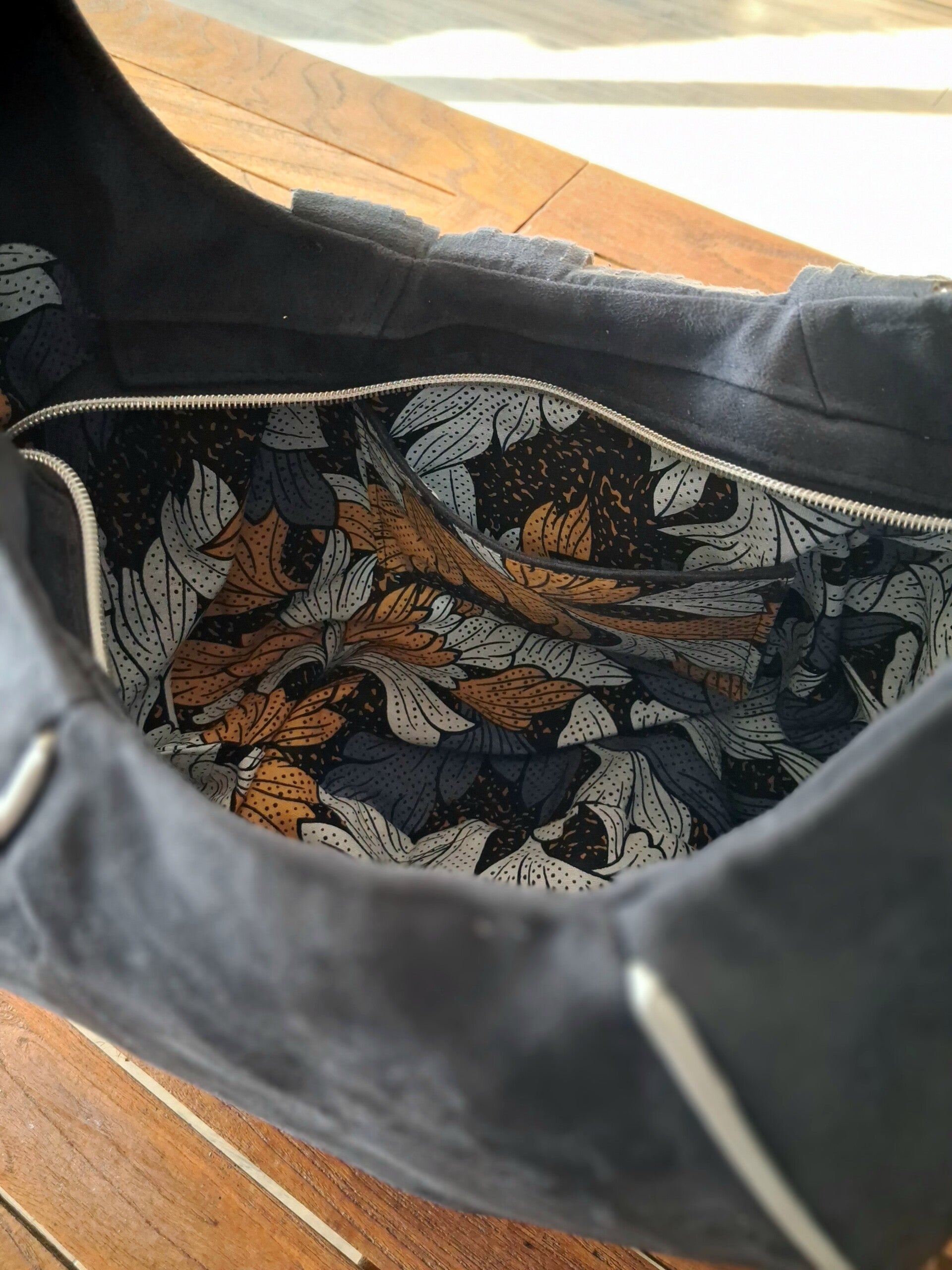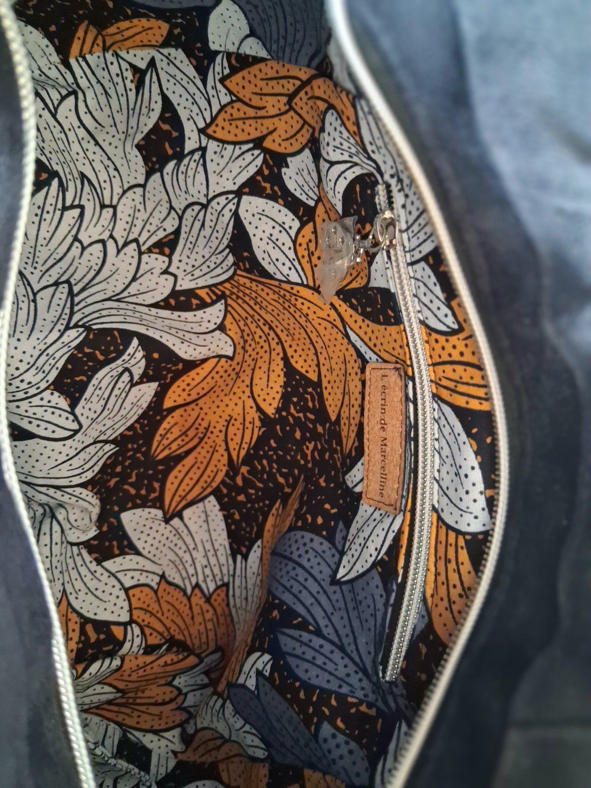 Doublure "Jardin d'Automne" : L'intérieur offre un contraste saisissant avec un tissu floral riche en couleurs (ocre, bleu et blanc), pour une touche de poésie à chaque ouverture.