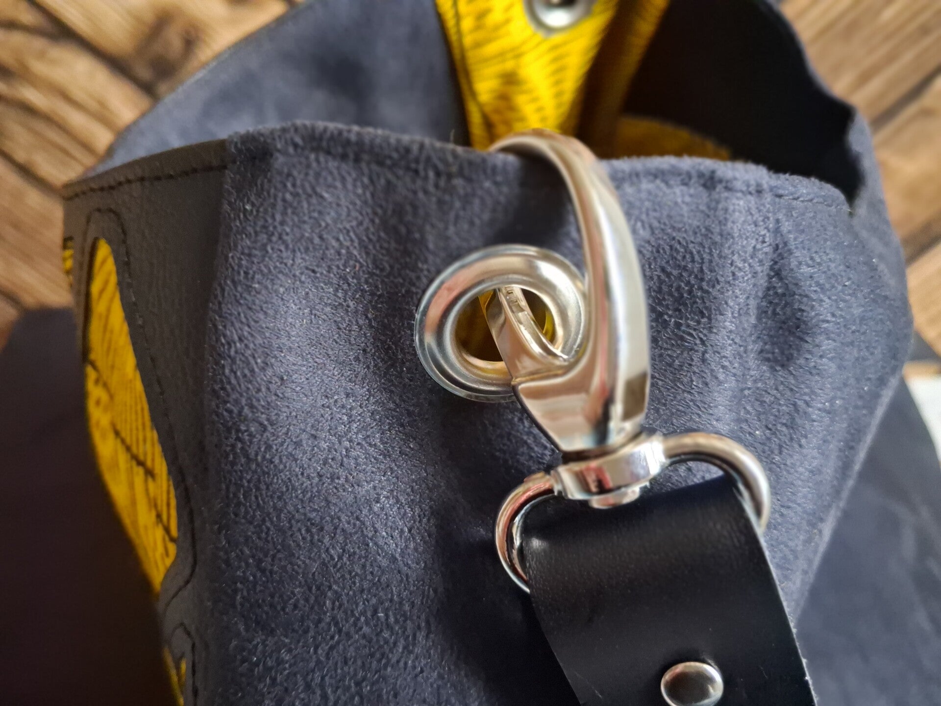 Détails Soignés : Anse en cuir noir lisse, large et confortable, fixée par des anneaux métalliques haute résistance, fermeture par bouton aimanté.