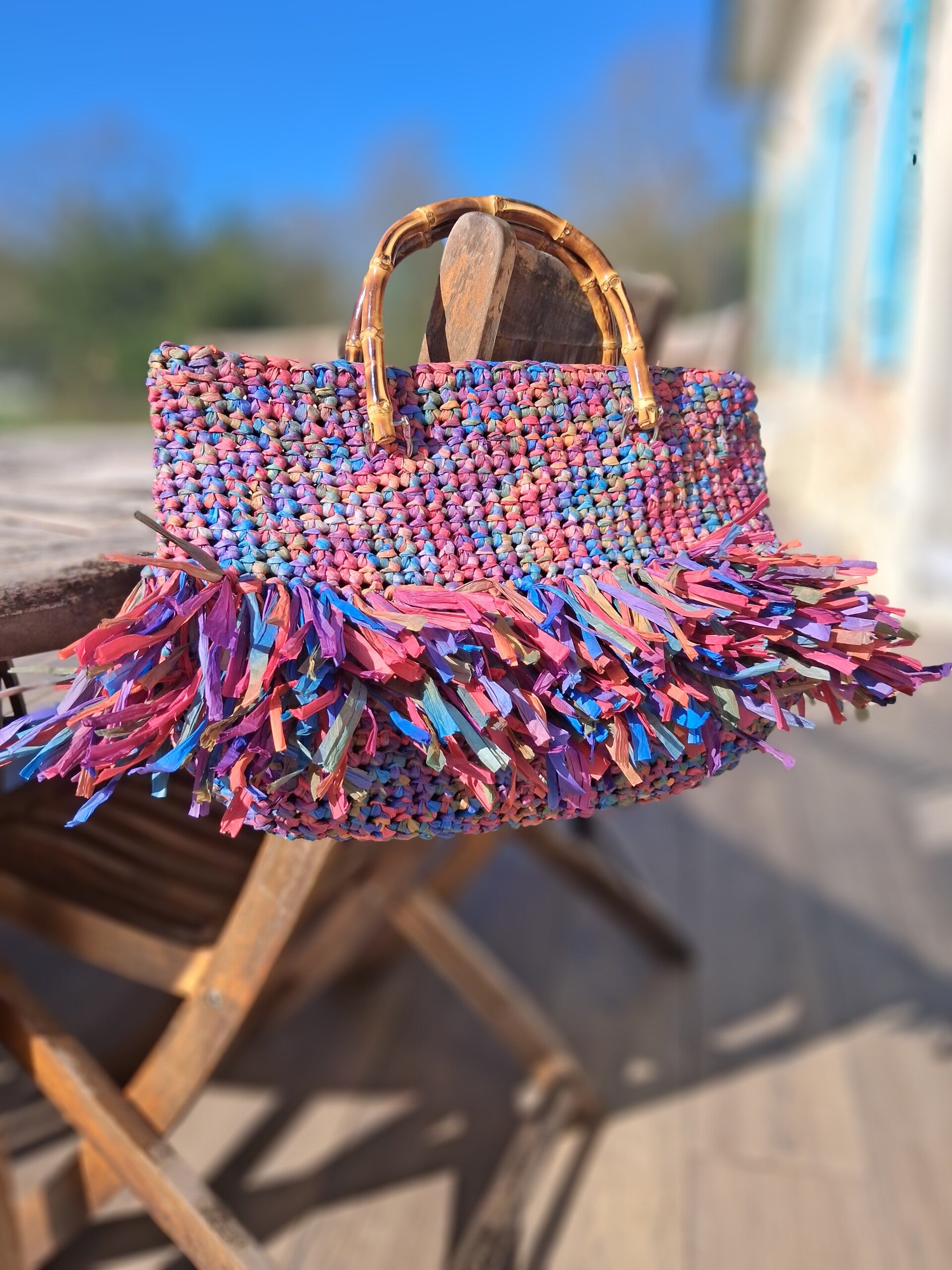 Inspiré par les paysages vibrants des côtes lointaines, Le Bahia déploie une palette chromatique audacieuse. Son tressage artisanal en raphia naturel alterne des nuances de bleu azur, d'orangé corail et de pourpre profond, créant un rythme visuel hypnotique.