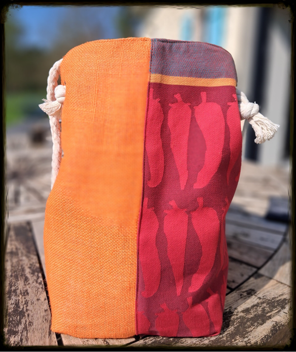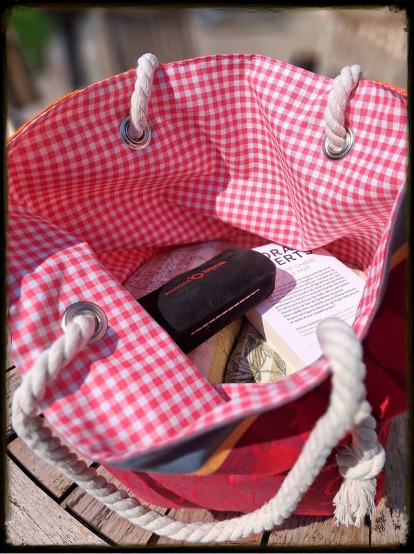 Toile de Jute naturelle teintée, doublure Coton Vichy rouge avec traitement enduit (déperlant), anses corde marine 100% coton – Diamètre 12 mm, quincaillerie oeillets métalliques haute résistance & Mousqueton intégré