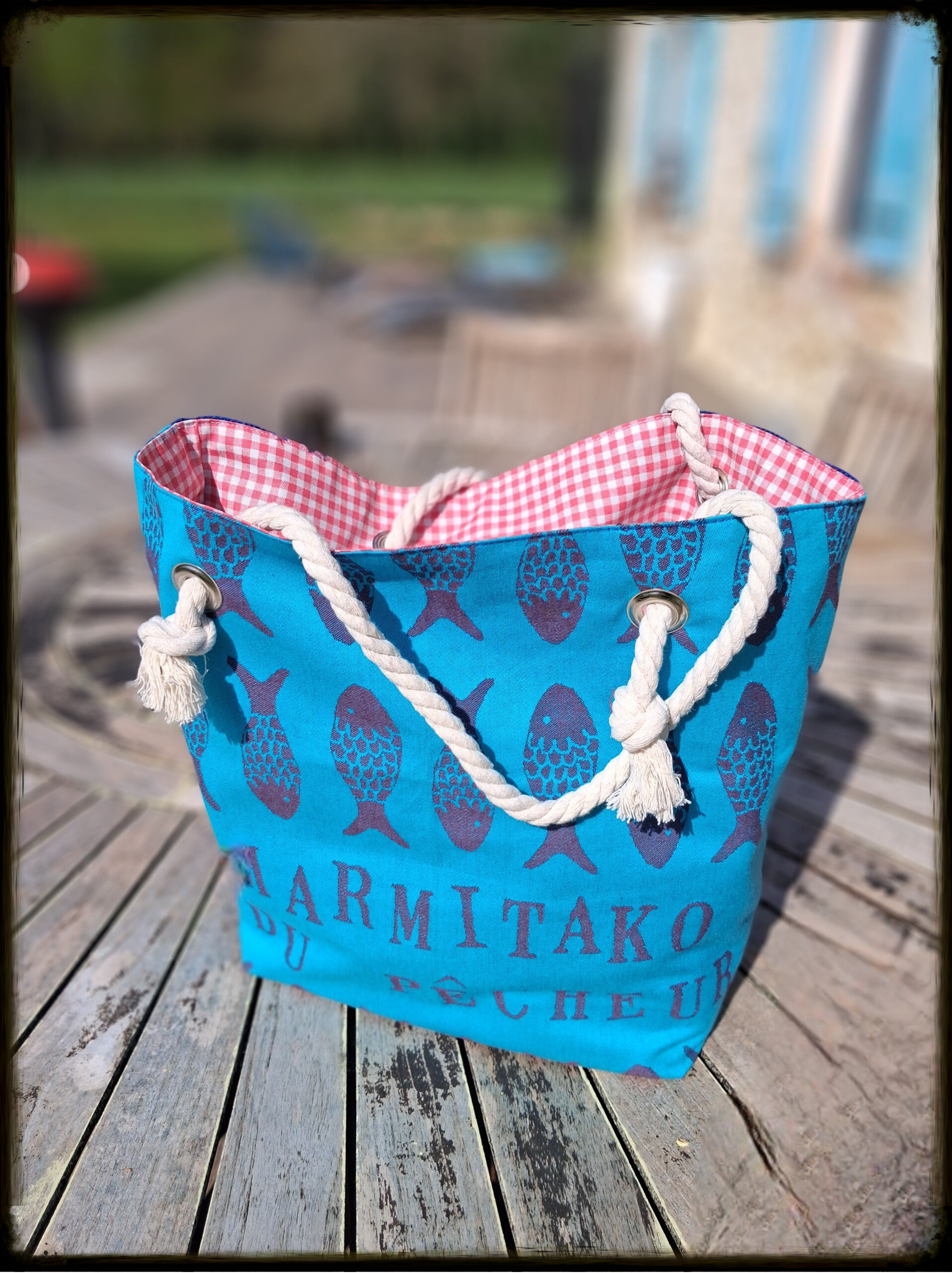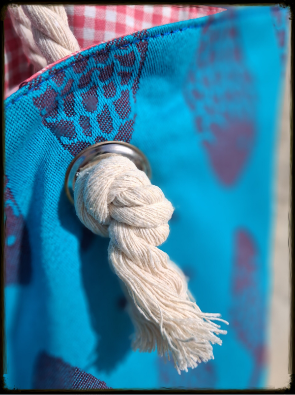 Toile de Jute naturelle teintée, doublure Coton Vichy rouge avec traitement enduit (déperlant), anses corde marine 100% coton – Diamètre 12 mm, quincaillerie oeillets métalliques haute résistance & Mousqueton intégré