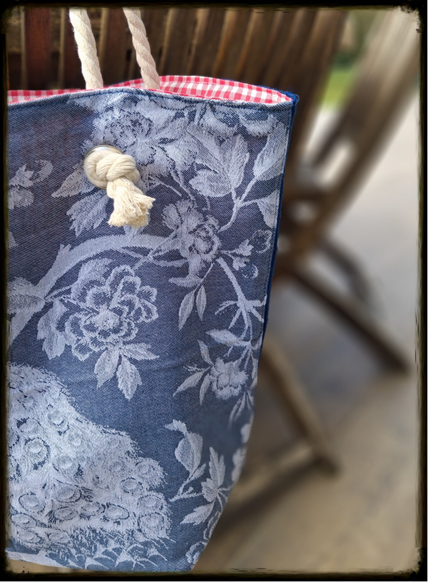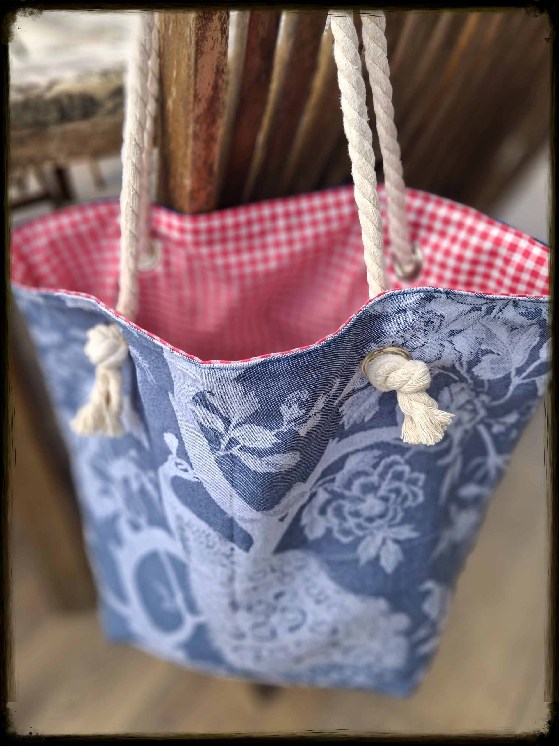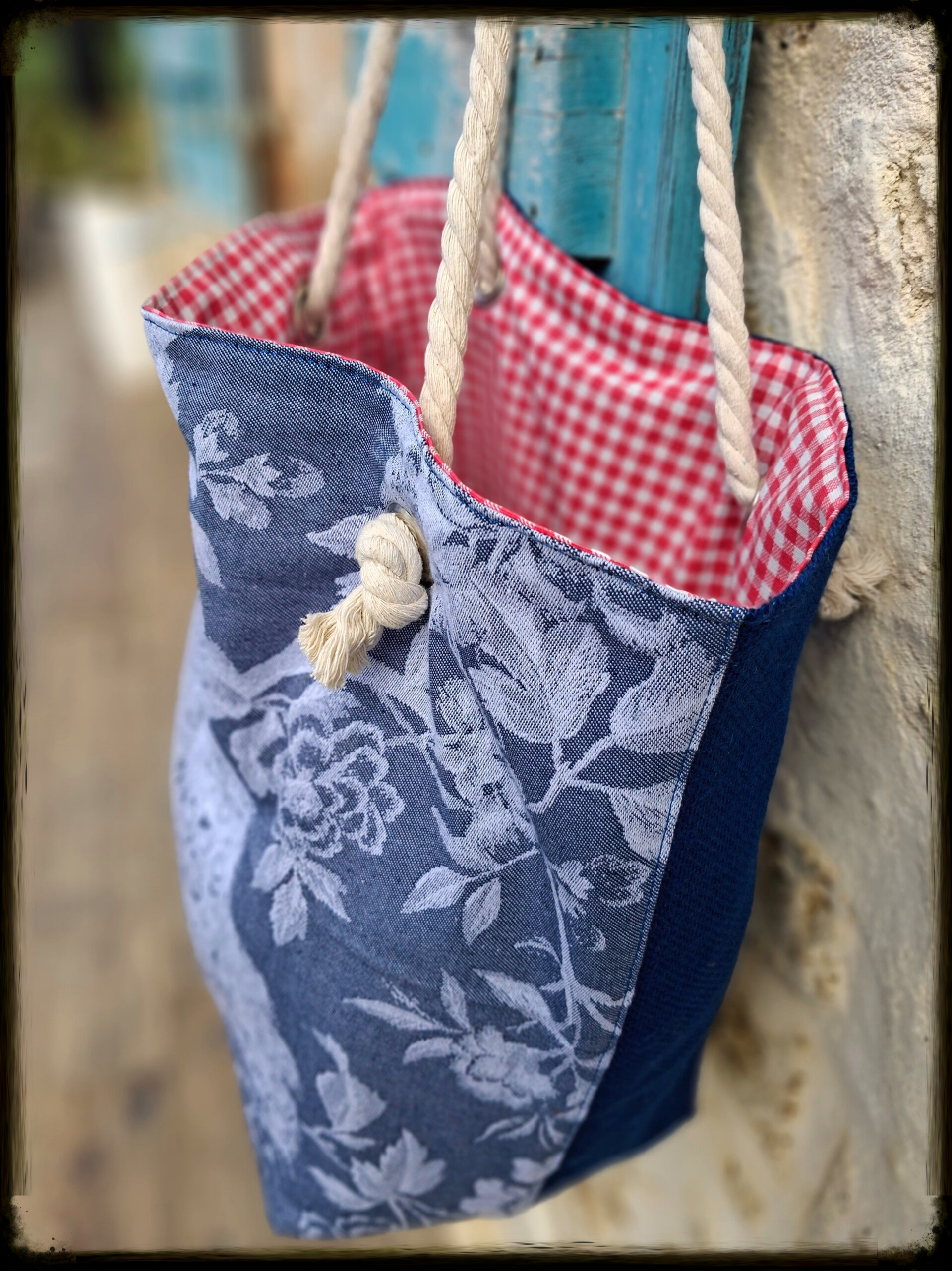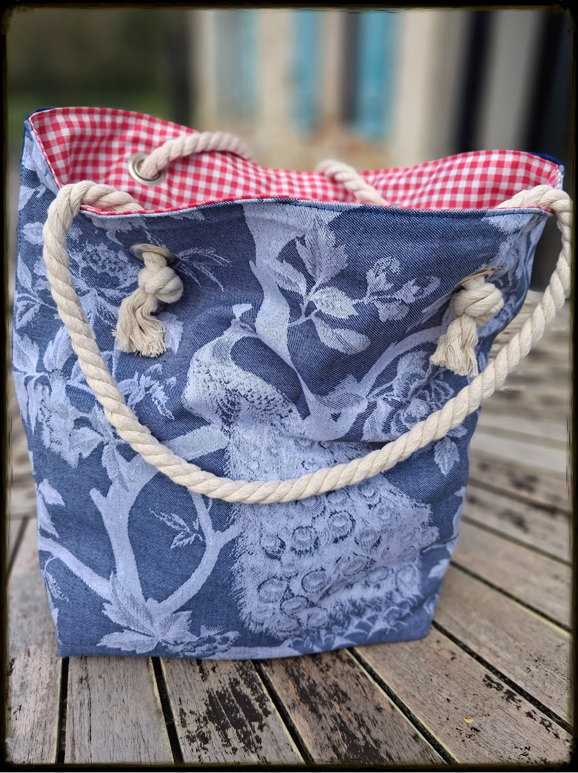 Toile de Jute naturelle teintée, doublure Coton Vichy rouge avec traitement enduit (déperlant), anses corde marine 100% coton – Diamètre 12 mm, quincaillerie oeillets métalliques haute résistance & Mousqueton intégré